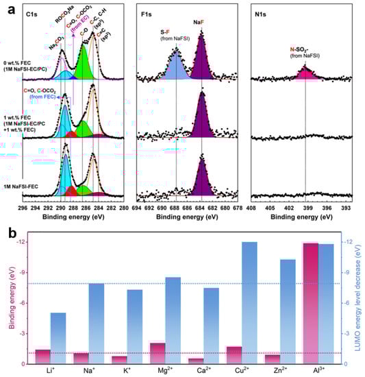 (a) C 1 s, F 1 s, and N 1 s XPS spectra of the Na metal anode surface during the initial Na plating. Reproduced with permission from Reference [70] Copyright 2018, American Chemical Society. (b) The comparison of LUMO energy levels decreases and binding energy of ion–DME complexes. Reproduced with permission from Reference [71] Copyright 2020, Elsevier.