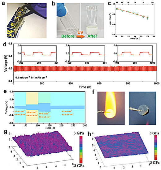 (a) Photograph of a hybrid crosslinked SPE membrane, reproduced with permission from Reference [96] Copyright 2018, Wiley−VCH. (b) Photograph of ETPTA-NaClO4-QSSE before and after UV curing. (c) Ionic conductivity of ETPTA-NaClO4-QSSE under varying temperatures. (d) Cycling profiles of the symmetrical battery at 0.1 mA cm−2 for 1 h, reproduced with permission from Reference [99] Copyright 2021, Wiley−VCH. (e) Cycling profiles of the symmetric battery at different current densities, reproduced with permission from Reference [100] Copyright 2021, American Chemical Society. (f) Flame test of glass fiber saturated with 1.0 M NaClO4/PC and P(MVE-alt-MA), reproduced with permission from Reference [101] Copyright 2019, Springer Nature. Surface Young’s modulus of (g) 2-GPH and (h) PH, reproduced with permission from Reference [102] Copyright 2020, Wiley−VCH.