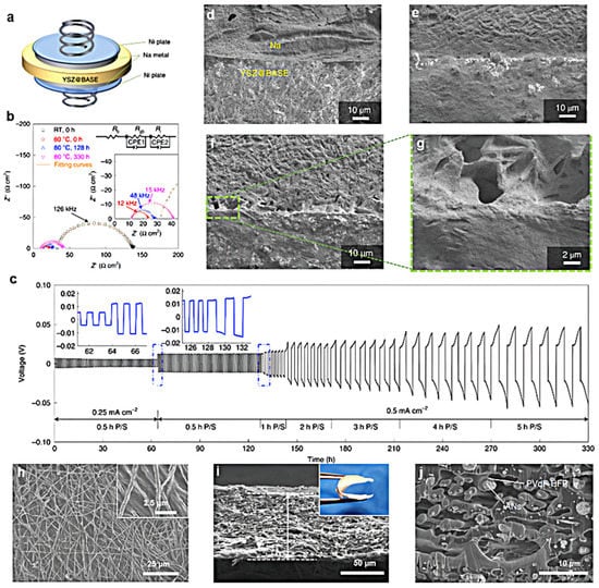 (a) Schematic configuration of Na||Na symmetric battery; (b) comparison of EIS of the Na symmetric cells at RT and 80 °C with the cycling of 0, 128, and 330 h; (c) galvanostatic cycling of the Na symmetric cell at 80 °C at 0.25 and 0.50 mA cm−2; the corresponding SEM images of YSZ-Na-β″-Al2O3/Na interfaces at 80 °C with cycling times of (d) 0 h, (e) 128 h, and (f,g) 330 h, reproduced with permission from Reference [112] Copyright 2022, Springer Nature. (h) Surface, (i) cross-sectional SEM images, and (j) enlarged cross-sectional SEM image of ANs-PVdF-HFP membranes, reproduced with permission from Reference [114] Copyright 2019, Springer Nature.