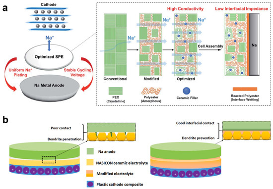 (a) Schematic of the optimizing steps for the proposed composite SPE, reproduced with permission from Reference [52] Copyright 2021, Royal Society of Chemistry. (b) Illustration of the grain boundary engineered ceramic electrolyte depressing the Na dendrites in all-solid-state NMBs, reproduced with permission from Reference [118] Copyright 2021, Elsevier.