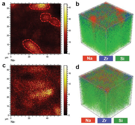 (a) Mapping of Na species and (b) overlay depth profile of Na, Zr, and Si on TS1300-15/1200 after cycling; (c) mapping of Na species and (d) overlay depth profile of Na, Zr, and Si on NS1250 after cycling, reproduced with permission from Reference [121] Copyright 2021, Elsevier.