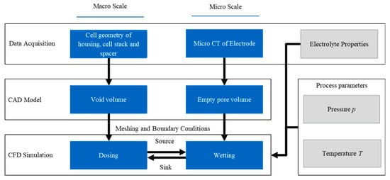 In order to develop a model of the electrolyte filling process, factors such as the cell format, material system and process parameters are considered. Figure 1 shows an overview of the concept for the model. This includes how the data for the geometries and material properties are acquired and processed, as well as the parameters considered. First, the initial situation is assessed: the cell geometry of the housing, cell stack and spacer as well as the material properties of the electrodes, the separator and the electrolyte. These are often determined by the cell design and are therefore handled as given from a production perspective. In the following step, the initial conditions are converted into a computer-aided design (CAD) model. In the macro environment (dosing), it is the empty cell volume not occupied by the cell stack. For the micro approach, the pore structure of a cathode active material is modeled. Once the geometry is set up, boundary conditions are applied and a mesh is generated. Suitable simulation parameters are determined for the dosing and wetting simulations. Since the time scales of the macro and micro simulations are significantly different (seconds vs. hours) [13], the simulation runs are carried out independently of one another. For the macro simulations, wetting is neglected and the electrode is considered a black box. For the micro simulations, the dosed volume provides an electrolyte reservoir for the micro environment. These are called the source and the sink within the simulations, as shown in Figure 1.