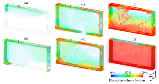Results of the macro simulation showing the electrolyte flow through the cell after dosing during time steps (a) 0.05 s, (b) 0.2 s, (c) 0.4 s, (d) 0.6 s, (e) 1 s and (f) 15 s of dosing time. The initial pressure in the void volume (= 50 mbar) and dosing pressure at the cell inlet (pinlet = 300 mbar) generated the pressure difference (Δp = 250 mbar) for the electrolyte dosing. The temperature of the cell and of the electrolyte were set to 25 °C.