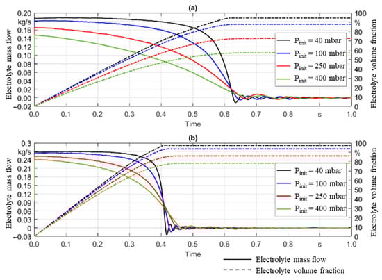 Influence of pressure variation on the mass flow and volume fraction of electrolyte as a function of time is shown. (a) Gauge pressure of 1000 mbar and temperature of 25 °C were applied with varied initial evacuation pressure from 40 mbar to 400 mbar. (b) Gauge pressure is increased to 2000 mbar with the same temperature and initial evacuation pressures.