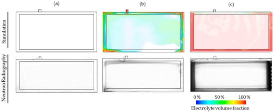The empty cell is shown at a time of 0 s in Figure 6a. The simulations show that no fluid has entered and the NR image is completely white, which indicates the same. At a time of 0.25 s in Figure 6b, the dosing has begun and the electrolyte begins to flow into the void volume of the cell. The areas with the highest electrolyte concentration, such as the filling port and bottom corners, are shown in red in the simulations. Similarly, the NR images show the electrolyte concentrations that are indicated by the darker areas, which are seen in the same regions as the simulations proposed (filling port and bottom left corner). Finally, Figure 6c shows the cell after the dosing has finished and the electrolyte is settled, after roughly 15 s. Both the simulation and NR image show similar patterns regarding the location of the electrolyte liquid. Moreover, similarities in the areas where the excess gas accumulates are shown, which verifies the validity of the simulations. It is important to note that this is a qualitative check of the simulation results of the images captured in-operando while filling a battery cell. Further tests such as NR or X-Ray tomography, which produce 2D images, are required to validate the model.