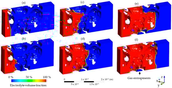 Micro simulation results of the electrolyte flow during the wetting of the cell during time steps (a) 0.0 s, (b) 3.9 × 10−5 s, (c) 2.5 × 10−5 s, (d) 1.0 × 10−5 s, (e) 1.6 × 10−5 s and (f) 2.5 × 10−5 s of filling time. Each section represents a small section (3 × 10−5 m, or 30 µm) of the battery electrode. Fluid starts on the left side of the cell and slowly enters the gas-filled pores. Process parameters such as pressure and temperature are neglected, and the fluid moves purely due to the capillary forces acting on the porous media.