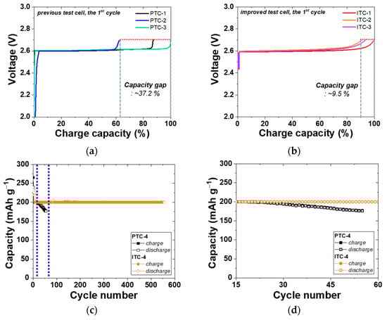 Previous test cells (PTC-1, 2, and 3) and improved test cells (ITC-1, 2, and 3) were tested inside the air-filled glove box that had sustained oxygen and moisture concentration of less than 1.0 ppm. The operation temperature was set up at 300 °C. These cells were cycled using VMP3 (Bio-Logic SAS, Seyssinet-pariset, Grenoble, France) between 2.4 V and 2.7 V, and the C-rates of previous test cells (PTC-1, 2, and 3) and improved test cells (ITC-1, 2 and 3) were set to C/24 and C/8, respectively. In the cases of PTC-4 and ITC-4 cells, a few cycles were started for stabilization before the constant capacity test. At the end of stabilization cycles, the charge process was started with a constant current method of 2.67 V, and then applied constant voltage method to the capacity of 200 mAh g−1. In contrast, the discharge process was conducted with only the constant current method set to capacity of 200 mAh g−1 and no cut-off voltage set-up. A limit for operation time was not set-up separately for PTC-4 and ITC-4 cells, however, ITC-4 cell was stopped due to the black-out after operating for approximately 7200 h.
