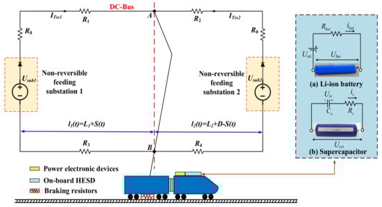 A schematic diagram for an electric train with on-board HESDs in DC traction supply network.