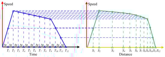 In this section, the formulations of train longitudinal dynamics, DC traction power system, and on-board HESDs power flow based on the time-MILP approach are elaborated. Although the researchers in our group have published some works on distance-based MILP models [19,35,37], which have been proved to have excellent robustness and fast optimization characteristics, heavy computational burdens are obtained when calculating the nonlinear constraints, especially the derivation of SOC for on-board HESDs and product operation of multiple time-varying parameters. Alternatively, as shown in Figure 2, the discretization process of the proposed, time-based MILP model is revealed, where each time segment is a known parameter and the distance are variables. After discretizing the travel time for the entire journey, the starting and ending speed data for each distance can be collected. It should be noted that a shorter time segment means that the optimization results are more accurate, but the computational time of the model will be longer.
