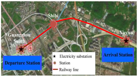 The average energy efficiency of on-board HESDs and is set to be 0.9 considering negligible transmission loss [19]. In [44,45], the efficiency of the advanced DC and induction motors are about 90–94% and 93–95%, respectively, and then approximately set as 90%. By exploring the model, is shown to provide a better compromise between computational burden and accuracy. As mentioned in [17], the maximum traction power and braking power are obtained in the field test, as well as maximum tractive effort and braking effort. All of these parameter values in Table 3 can be modified according to the field data collected from different types of traction power systems and on-board HESDs. This paper presents a simulation where the used parameters are provided by the Guangzhou metro line 7 for journeys from Guangzhou South Station to Xiecun Station. Table 4 shows the scheduled information of railway vehicles.