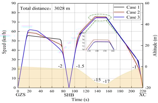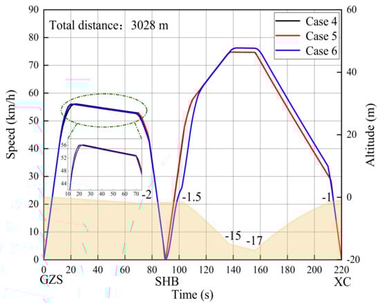 - Based on the optimization results in Section 4.1, we aimed to reveal the impact of the different initial SOC on the train operation and further explore the energy-saving potential of on-board HESDs. Similarly, three typical initial SOC values are selected in cases 4–6, which correspond to the minimum allowable value, the middle value, and the maximum allowable value, respectively.