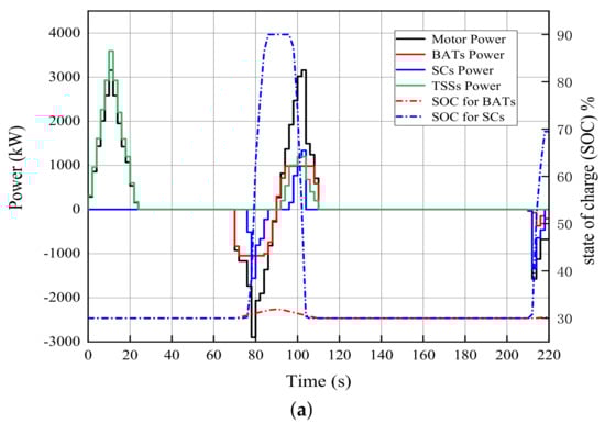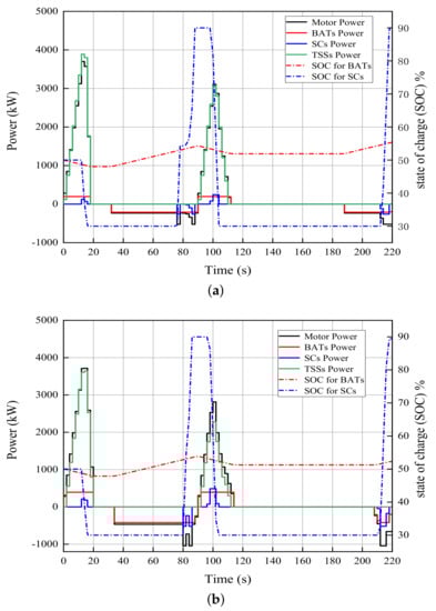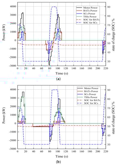 The motor power, TSSs power, discharge/charge power of on-board HESDs and SOC curves for cases 2–3. (a) case 2. (b) case 3.