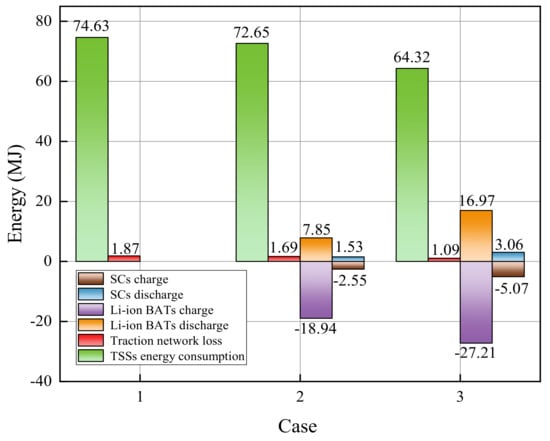In this subsection, the influence of different on-board HESDs capacities on power split and train operation under capital cost constraints is investigated. As a comparison, the capacity of on-board HESDs in Case 1 is assumed to be 0 MJ, to indicate that the train is not equipped with on-board HESDs. Concerning cases 2 and 3, the specific capacity configuration of on-board HESDs and optimization results are shown in Table 5. The initial SOC for the on-board HESDs is 50% for cases 2 and 3, which can be modified in the model.