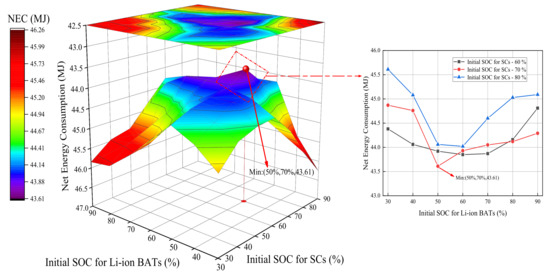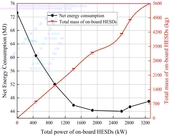 When the initial SOC of the on-board HESDs remains unchanged in cases 2 and 3, the NEC decreases and the energy-saving rate rises by increasing the maximum power and capacity of the on-board HESDs. However, Figure 8 clearly shows that by continuously increasing the power and capacity of the on-board HESDs, the NEC solutions slightly increase due to the increase in total mass. As a result, the minimum NEC can only be obtained when the power and capacity of the on-board HESDs change and the initial SOC remains unchanged. In addition, the lower or excessive initial SOC of the on-board HESDs could undermine the energy-saving potential of integrated systems in cases 4–6 when the optimal capacity is obtained. It is worth mentioning that although the energy-saving rate of railway vehicles could reach up to 41.57% in case 7, after considering the long-term train operation, the energy-saving rate would drop to 31.90% in case 8 due to the degradation of Li-ion BATs. The optimization results provide clear guidance on how to select and utilize on-board HESDs and avoid unnecessary waste in real engineering applications.