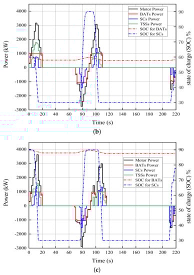where and are the charge power of the Li-ion BATs and SCs, respectively. Note that when the train conducts regenerative braking, , , , and are both assumed to be negative quantities.