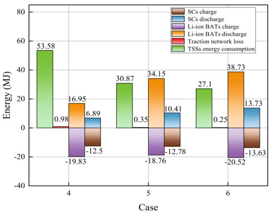As shown in Figure 5 and Figure 6, the optimal operation of the train and power split show substantial differences when the capacity and power of on-board HESDs are different in cases 1–3. From Figure 5, when the railway vehicle operates without on-board HESDs in case 1, this means that the trains cannot recover and reuse regenerative braking energy through electrical braking. It should be noted that the train operation conforms to the law of conservation of energy, and when the output power is less than 0, this means that the on-board HESDs are in the charging state. In Figure 6, it can be observed that the propulsion energy of the train mainly comes from the non-reversible feeding TSSs and discharge energy from on-board HESDs during traction operation. Subsequently, the potential energy of the train caused by height differences can be converted into kinetic energy, on-board HESDs energy, and heat energy. During the train’s braking operations, the kinetic energy can be converted into electrical energy, which can be recovered by the on-board HESDs. In addition, it is evident that the charge/discharge rate of SCs is significantly faster than that of Li-ion BATs due to their respective characteristics. The SCs are discharged to a minimum SOC value, i.e., 30% during traction operation, and charged to a maximum SOC value, i.e., 90% during braking operation, while the SOC of the Li-ion BATs slowly changes throughout the journey.