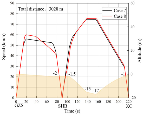 - Based on the optimization results in Section 4.1 and Section 4.2, on-board HESDs with optimal capacity and initial SOC were selected to reveal the impact of degradation on train operation. Cases 7 and 8 correspond to fresh and end-of-life cells, respectively, which fully demonstrate the significant differences in optimal train operation and power split strategies under different states of health.