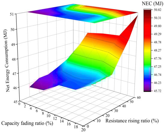 The NEC under varying capacity fading ratio and internal resistance rising ratio of Li-ion BATs.