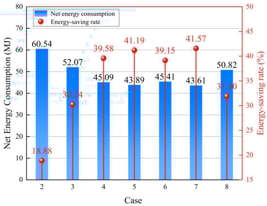 The net energy consumption and energy-saving rate for cases 2–8 are plotted in Figure 18. Note that the energy-saving rate of the abovementioned cases is calculated in reference to case 1 without on-board HESDs. Figure 18 shows that by optimizing the capacity and initial SOC of on-board HESDs, it is indeed possible to achieve energy-saving operation for electric trains in the given journey.