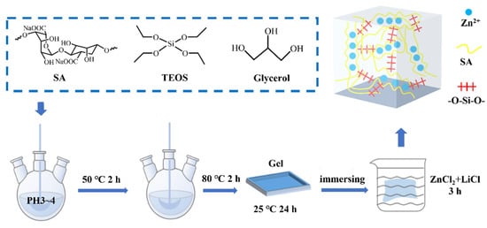 SiO2- and SA-network hydrogel electrolyte (SiO2-SA GPE) was prepared through the one-pot method. Figure 1 illustrates the schematic diagram of the preparation process of SiO2-SA GPE. SA (3.0 g) and set amounts of tetraethyl orthosilicate (TEOS: 0, 4, 8, 12 and 16 mL) and glycerol (3.5 mL) were dispersed in 50 mL of deionized water in a three-neck flask at 60 °C with mechanical stirring, and the pH was adjusted to 3–4 with hydrochloric acid for 2 h. Glycerol was chosen as a plasticizer. The three-neck flask was then heated to 80 °C. The above reaction was continued for 2 h until the tetraethyl orthosilicate hydrolyzed and the byproduct evaporated completely. Finally, the mixture was poured into a polytetrafluoroethylene mold and placed for 24 h to obtain the SiO2-SA gel matrix. The substrate was immersed into the well-mixed salt solution that consisted of 5 mol·L−1 ZnCl2 and 4 mol·L−1 LiCl to obtain SiO2-SA GPE. The prepared GPEs were labeled as GPE 3-x, where x = 0, 4, 8, 12, and 16 represented the amount of TEOS, which was 0, 4, 8, 12, and 16 mL, respectively.