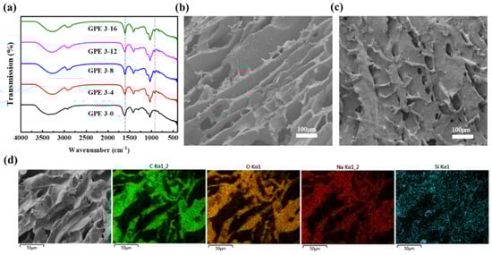 As shown in Figure 2a, the influence of different volumes of TEOS on the SiO2-SA GPE structure was investigated by FT-IR. The broad band at 3300 cm−1 was attributed to the O–H stretching vibration in the polymer chains of SA. The bands located at about 1612 cm−1 and 1410 cm−1 were assigned to the -COO- asymmetric stretching vibration and symmetric stretching vibration in the alginate chains []. After the addition of TEOS, two new peaks were found at 921 cm−1 and 846 cm−1, which belonged to the stretching vibration of Si-OH and symmetric stretching vibration of -O-Si-O-, respectively []. Results indicated that TEOS had hydrolyzed and produced -O-Si-O-. The interaction might be formed through a hydrogen bond between -O-Si-O- and SA []. Figure 2b shows the cross-section of GPE, where a regularly arranged layer-by-layer structure was found. As demonstrated in the surface morphology (Figure 2c), GPE had multiple holes that promote the transport of Zn2+ ions and endow GPE with excellent ionic conductivity. On the EDS element maps of GPE (Figure 2d), the four elements of C, O, Na, and Si in the GPE matrix were distributed uniformly. It was indicated that -O-Si-O- interacted with SA, and the GPE hydrogel matrix was successfully prepared.