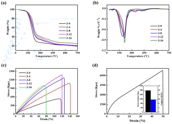 The (a) TG and (b) DTA curves of GPE; (c) stress-strain curves of GPE; (d) Stress-strain curves of GPE 3-12 after immersed in 5 mol L−1 ZnCl2 and 4 mol L−1 LiCl.