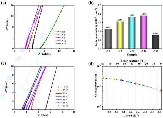 where was the thickness of the GPE (cm), R was the body resistance (Ω), A was the area of contact surface between the electrode material and GPE (cm2), and was the ion conductivity (S·cm−1) []. The corresponding ionic conductivity is shown in Figure 4b. The changes in ionic conductivity and internal resistance of GPE showed the opposite trends. The ionic conductivity of GPE 3-12 is 1.144 × 10−2 S·cm−1, which is larger than that of GPE 3-10 (1.097 × 10−2 S·cm−1) and GPE 3-16 (0.484 × 10−2 S·cm−1) owing to the appropriate three-dimensional hole structure of GPE 3-12. When the ratio of SA to TEOS increased to 3-16, the resistance of related samples increased, but the corresponding ionic conductivity decreased, which might be owing to the excessive networks blocking the ion transport channels. On the other hand, the lowest ionic conductivity of 3-16 mainly resulted from the excessive TEOS with the root cause that the inherent hydrophobic nature of Si–O–Si reduced the affinity between the Zn2+ ions and the hydrogel framework ions []. Results illustrated that the best ratio of SA to TEOS was 3-12, which was consistent with the results obtained by a stretching test. Therefore, the SiO2-SA GPE prepared at the ratio of SA to TEOS of 3-12 was chosen for further investigation. Temperature has an important impact on battery performance. Extremely harsh temperature conditions can cause capacity decline and lifespan damage. Therefore, the impedance and ionic conductivity of GPE were studied at different temperatures (Figure 4c,d). When the temperature was changed from 80 °C to 0 °C, the ionic conductivity of GPE decreased from 26.4 × 10−2 to 6.23 × 10−2 mS·cm−1. Both SA and silicone linkages was considered to possess good thermal stability of and the inherent anti-freeze resistance of glycerol and salt, which makes GPE have a wide range of temperature applications. Therefore, GPE still showed relatively stable electrochemical properties in extremely harsh environments [].