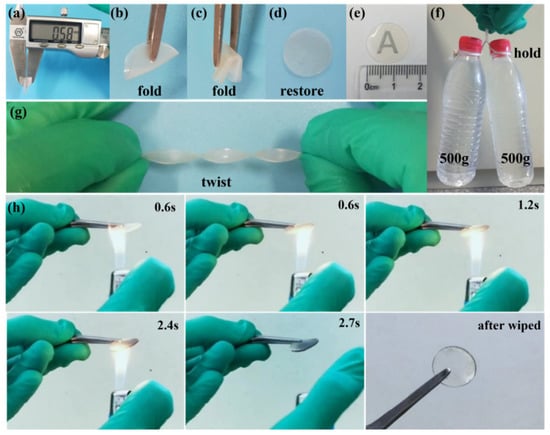 The physical properties of SiO2-SA GPE were studied and are shown in Figure 5. As illustrated, the thickness of the SiO2-SA GPE was 0.58 mm (Figure 5a). It could be bent and folded at any angle and restored to its original shape (Figure 5b–e). It was commendable that after being made into thin strips (length of 60 mm and width of 4 mm), it could withstand a weight of 1 kg and be easily twisted without breaking (Figure 5f,g), indicating that the prepared GPE had excellent flexibility, strength, and toughness. The combustion test of GPE was further studied (Figure 5h). It showed that GPE cannot be burnt under open flame. After contacting with fire for 2 s and wiping the surface, GPE kept its morphology well. The stringent experiment was sufficient to demonstrate the excellent flame-retardant property of the prepared SiO2-SA GPE to ensure the perfect safety of batteries.