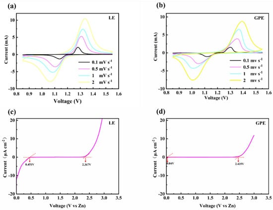 To examine the electrochemical properties of Zn/GPE/LFP cells, cyclic voltammetry (CV) measurements were performed at room temperature from 0.1 mV s−1 to 2 mV·s−1. The oxidation peak in the forward scan represented the release of lithium ions and the reduction peak in the reverse scan represented the insertion of lithium ions. As shown in Figure 6a,b, it could be seen that the CV curves in the two electrolyte systems were very similar, both exhibiting clear and distinct anodic and cathodic peaks, which proved the excellent chemical reversibility of the Zn/GPE/LFP hybrid batteries. The GPE demonstrated a total operating voltage window of 2.4 V (Figure 6d), which was broader than that of the LE (Figure 6c). Therefore, GPE can match almost all AZIBs [,,].