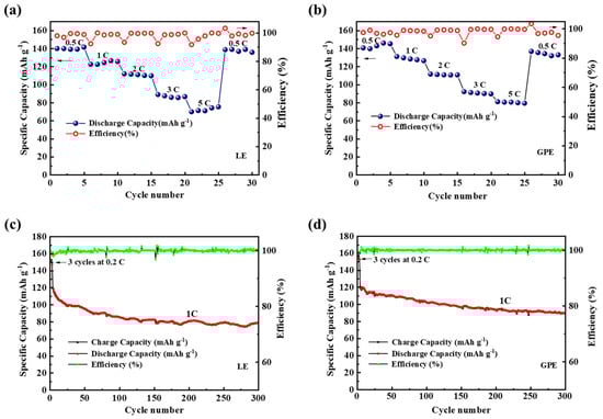 Rate capability of (a) Zn/LE/LFP and (b) Zn/GPE/LFP, respectively. Cycle performances and Coulombic efficiency of the (c) Zn/LE/LFP and (d) Zn/GPE/LFP batteries at 1 C.