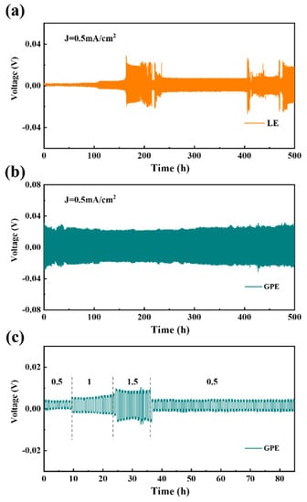 Galvanostatic tests of (a) Zn/LE/Zn and (b) Zn/GPE/ Zn at 0.5 mA·cm−2, (c) voltage profile of a Zn/GPE /Zn cell under various current densities.