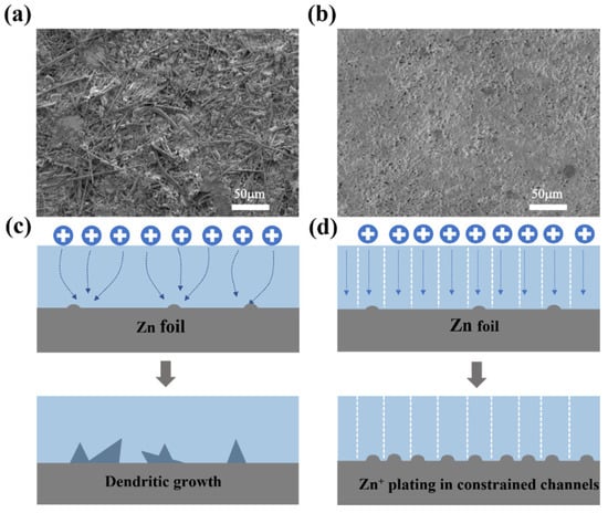 Figure 9a,b show the SEM pictures of the Zn foils after cycling 500 h. It could be observed that after a constant charge/discharge process for 500 h (Figure 9a), the surface of the Zn foil in Zn/LE/Zn was rough and many rod-like materials that should be zinc dendrites were deposited. The zinc dendrites could penetrate the separator and cause short circuits and serious safety problems. From Figure 9b, it can be surveyed that after a 500 h charge/discharge process of constant current, the surface of the Zn foil of Zn/GPE/Zn was smooth without obvious dendrites. Figure 9c explains the deposition mechanism of zinc ions in LE. The zinc ions diffused in a disorderly manner on the zinc anode, and the formation and growth of dendrites led to the diaphragm being punctured. The deposition mechanism of zinc ions in GPE is declared in Figure 9d. On the one hand, the independent pore structure makes a Zn layer uniformly, thus inhibiting the formation of Zn dendrites, and, on the other hand, the robust mechanical properties of GPE further prevented Zn dendrites from penetrating GPE []. Therefore, the prepared SiO2-SA GPE could enable the zinc anode to obtain better reversibility and stability and improve the electrochemical performance of AZIBs.