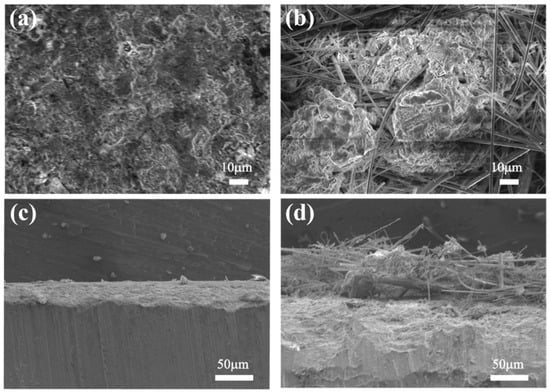 The surface morphology of Zn after 300 cycles in (a) Zn/GPE/LFP and (b) Zn/LE/LFP; the cross-sectional morphology of Zn after 300 cycles in (c) Zn/GPE/LFP and (d) Zn/LE/LFP.