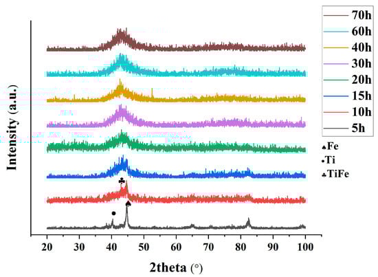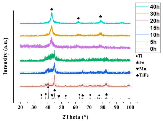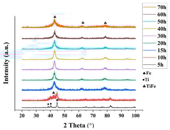 In the case of milled products of powder mixtures with Mn substituted for Fe, single-phase TiFe-based crystallites were achieved after 20 h of milling; however, the XRD pattern of the Fe10 milled product exhibited more peak broadening and in turn smaller mean crystallite size. The XRD patterns of the Fe10 milled product after different milling times are presented in Figure 2.