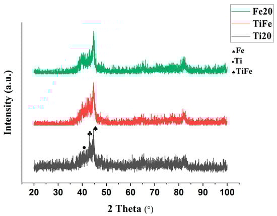 XRD patterns of Ti20, TiFe, and Fe20 alloys after 10 h of milling.