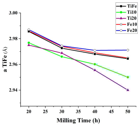 Lattice constant of TiFe-based crystal structure after different milling times for TiFe, Ti10, Ti20, Fe10, and Fe20 milled products.