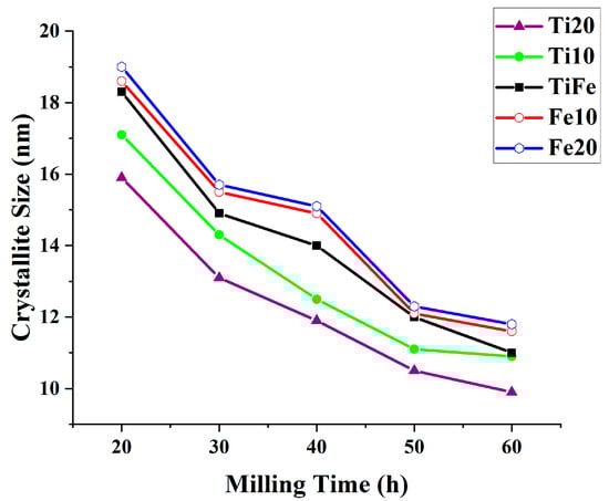 Crystallite size of TiFe-based crystal structure in TiFe, Ti10, Ti20, Fe10, and Fe20 milled products as a function of milling times.