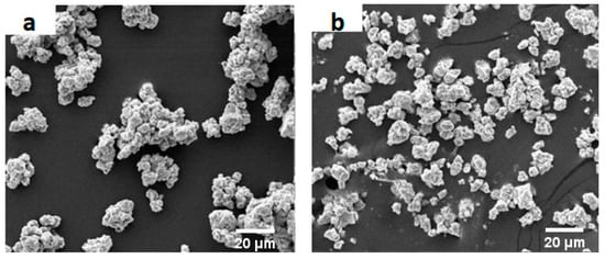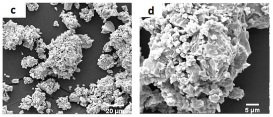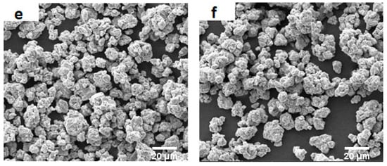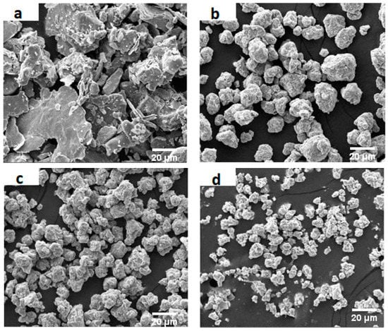 SEM images of raw powder materials used in high-energy ball milling are presented in Figure S1 (in the Supplementary Materials). Figure 8 shows SEM images of TiFe-based milled products after different milling times.