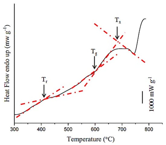 DSC curve of TiFe milled product after 15 h of milling (Tr is the first exothermic transformation temperature regarding the release of strain stored in the composition during 20 h of milling. Tg is the endothermic transformation regarding the rearrangement of atoms before crystallization. Tx is the second exothermic transformation temperature regarding the crystallization of TiFe compound).