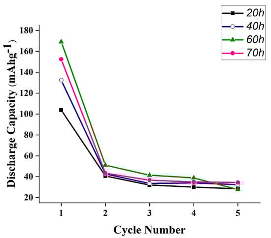 As can be seen in Figure 11, as the milling time increases to 60 h, the maximum discharge capacity in the first cycle increases, but in the 70 h-milled product, the discharge capacity decreases in the first period. The TiFe intermetallic compound formed after 20 h of milling, and with the increase of the milling time, its amount increases in the milled product, and its mean crystallite size decreases. The latter provides better diffusion pass for charge and discharge of hydrogen which increases the discharge capacity as well, but in the 70 h milled product, the discharge capacity decreases; this could be due to the increase in strain and excessive distortion in TiFe-based lattice that limits the placement of hydrogen atoms in the lattice. Hence, less hydrogen is absorbed, and, in turn, the discharge capacity decreased.