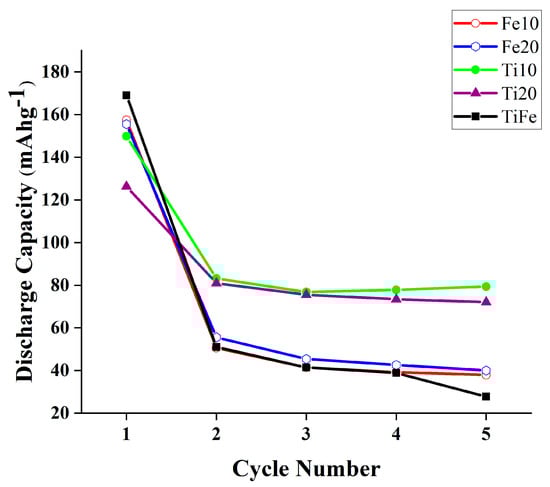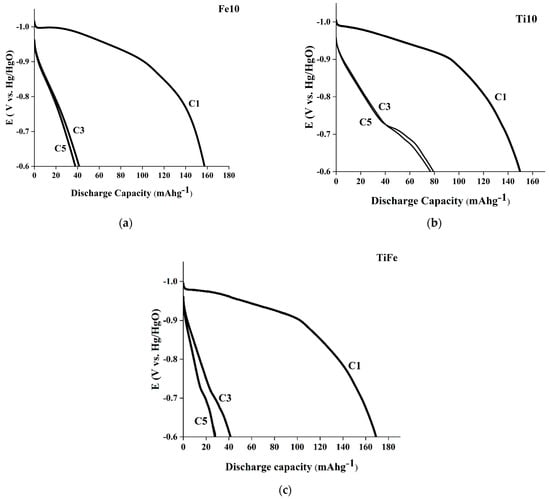 According to Figure 12, generally the addition of Mn increases the cyclic stability for the electrodes made from ternary milled product that Mn substitute for Ti (i.e., Ti10 and Ti20), but the initial discharge capacity decreases compared to binary TiFe electrode. By substituting Mn for Ti, the concentration of Ti in the milled product is reduced; this delayed the formation of TiO layer on the electrode as a reaction of Ti with KOH electrolyte. Incidentally, the addition of Mn increases the resistance to corrosion during the absorption (charge) and desorption (discharge) of hydrogen [28]. Thus, Ti0.9FeMn0.1 electrode (named Ti10) maintain ~53% of its initial discharge capacity after five cycles of charge–discharge; this is just 28% in the case of binary TiFe electrode. Figure 13 shows potential changes during discharge in the first, third, and fifth periods for the TiFe, Ti10, and Fe10 electrodes. Figure 13 shows the increase of the electrode potential from −1.2 to −0.6 V compared to the reference electrode, which is related to the release of hydrogen. In these experiments, the electrodes were charged with a current density of 800 mA/g for 1 h and discharged with a current density of 80 mA/g to a potential of −0.6 compared to the Hg/HgO reference electrode. According to Figure 13, the discharge curve changes in different cycles. In the first cycle, a smooth potential region is observed for all electrodes, which is related to the hydrogen removal process. By increasing the number of cycles, the hydrogen release potential (hydrogen discharge plateau) increases and the discharge duration decreases. Brittleness caused by the absorption and desorption of hydrogen during charge–discharge causes the cracking and breaking of particles that provides the formation of new surfaces. This intensifies the irreversible oxidation phenomena, so the discharge capacity decreases [29].