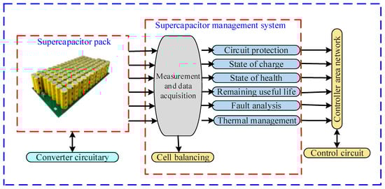The supercapacitor technology, also termed an electrode double layer capacitor (EDLC) ultra-capacitor, is considered an energy storage technology that differs from the conventional capacitor and battery system. The supercapacitor structure comprises electrode, diaphragm, electrolyte and fluid collector [13,14]. The effectiveness and performance accuracy of a supercapacitor is demonstrated in several applications, due to various factors mentioned earlier. However, the advancements in supercapacitor technology can be enhanced with the development of a supercapacitor management system (SMS). The SMS technology conducts various tasks such as current, voltage measurement, and signal processing from acceleration and regenerative braking, and monitors states such as state of charge (SOC), state of health (SOH) and remaining useful life (RUL) [8]. The schematic framework of an SMS is presented in Figure 1.