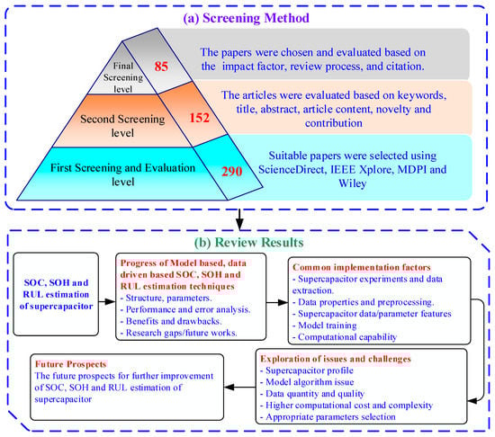 The review articles aim to deliver important discussion and analyses by gathering recent information regarding various techniques for SOC, SOH estimation, and RUL prediction in SMS. To conduct this review, the process of screening and analysis was conducted in three phases, to select the appropriate number of research articles. In the first phase of screening and analysis, some important databases such as Scopus and Web of Science (WoS) were utilized to perform a detailed survey of SOC, SOH, and RUL methods for supercapacitor technology. Several web platforms, such as IEEE Xplore, ScienceDirect, MDPI, Google Scholar, etc., were applied, to explore the suitable manuscripts. Furthermore, several keywords were employed to search for suitable research works within the scope and target, consisting of supercapacitor, state of charge, state of health, remaining useful life, supercapacitor management system, and electric vehicle, in the second phase of screening. Additionally, suitable research articles were searched for with respect to title, abstract, novelty, contributions and research gaps. A total of 290 papers were selected and analyzed. In the final phase of screening, the analysis was conducted based on the journal’s quartile, citation, impact factor and review process. In this way, 85 research articles were selected to draft the presented review paper.
