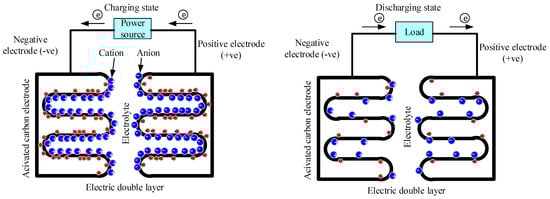 Based on the material classification, two operational modes can be observed for storing charges in a supercapacitor [24,25]. Firstly, a non-faradaic process is involved, in which double electrode layer (EDL) capacitance originates from EDL and results in electron accumulation at the electrode, as shown in Figure 3 [26]. Secondly, there is a faradaic process in which pseudo capacitance (PC) is observed, due to the occurrence of a redox reaction between an electrode and an electrolyte. The electrons generated during the redox reaction can be transported across the electrolyte-electrode interface. Even though the operational modes, i.e., EDL capacitance and PC, differ from each other, the pseudo capacitance mode is not dissimilar to a battery, due to the occurrence of a faradaic process on the pseudocapacitive material surface for a supercapacitor, as opposed to the same mode occurring in bulk for battery-type materials. The capacitive features of PC material are depicted in the cyclic voltammogram curve [27]. The operational modes discussed above could explain the internal process with EDL capacitance and PC-based electrodes. However, the functional operation with regard to the hybrid-based supercapacitor is more complex [28].