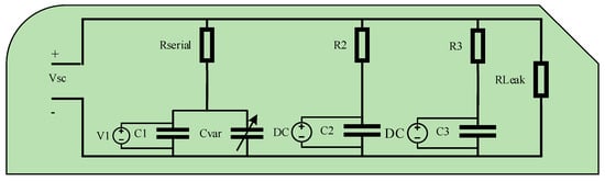 where denotes fixed capacitance, represents voltage-dependent capacitance and and denote the resistance and voltage in the second branch. and express the resistance and voltage in the third branch, and denotes the terminal voltage of the TBECM of the supercapacitor. A novel method based on the parameter estimation technique (PET) was introduced so that parameter fitting for TBECM could be performed accurately. The experimental validation was conducted based on different ratings of the supercapacitor in farad (F). The delivered outcomes suggested the superiority of TBECM over one branch ECM (OBECM) due to appropriate charge redistribution phenomena. However, the robustness and efficiency of the TBECM can be validated with online estimation in a real-time environment. Saha et al. [45] developed an ECM model for supercapacitor modeling to address the leakage effect due to faradaic reactions and short circuits (SC) between the electrodes. The proposed ECM for modeling supercapacitor dynamics is shown in Figure 5.