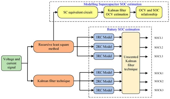 where, and represent the polarization voltage, battery OCV, and terminal voltage, respectively. and denote the polarization resistance and capacitance, respectively. signifies the battery current and is the ohmic resistance of the battery circuit. For supercapacitors, and represent the voltage across capacitance and terminal voltage, respectively. and are the equivalent series capacitance and resistance, respectively. denotes the current flowing through the supercapacitor. The prediction accuracy for the proposed UKF model was significant in terms of mean absolute error (MAE), and root mean absolute error (RMSE). However, further investigation could be carried out for energy optimization management and energy efficiency of hybrid storage technologies. Jarraya et al. [47] developed a real-time technique and EKF-based SOC estimation model for lithium-ion and supercapacitor storage technologies. Furthermore, the inclusion of the Recursive Least Square (RLS) and OCV method with a forgetting factor was performed, to obtain high estimation accuracy in a real-time environment. The estimation outcomes were validated based on different scenarios, and it was concluded that OCV and two online algorithms (RLS and EKF) achieved significant results (MAE) compared with other researches [48,49,50]. In addition, Jarraya et al. [47] discussed extending the presented work with more sophisticated algorithms with control and security features. Wang et al. [51] proposed different SOC estimation techniques for supercapacitor and lithium-ion batteries by applying KF and UKF models, respectively, as shown in Figure 6. The results demonstrated high accuracy for supercapacitor and lithium-ion SOC estimation, indicating [−0.94%, 0.34%] and [−1.16%, 0.85%], respectively.