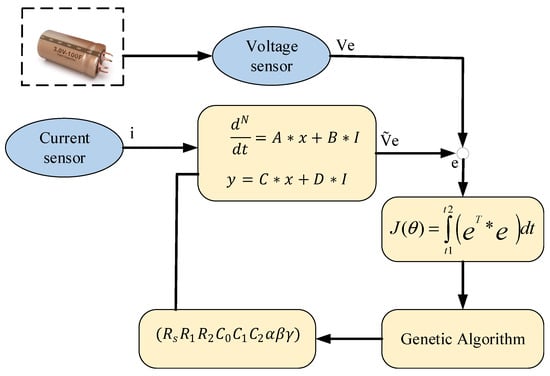 where, denotes the impedance of the proposed fractional model and and represent the series resistance and charge transfer resistance, respectively. C denotes the constant, denotes the total capacitance coefficient and and denote the fractional-order coefficient and capacitance dispersion, respectively. The fractional model parameters are determined by a genetic algorithm (GA) under various operating temperatures such as −40 °C, −20 °C, 0 °C, 20 °C, and 40 °C. The outcomes depicted stability and accuracy in characterizing electrical behavior. Wang et al. [42] proposed fractional-order modeling integrated with GA for parameter identification, as shown in Figure 7. The SOC estimation was achieved with a combined particle filter (PF) and fractional KF (FKF). The fractional-order model was analyzed with Kirchhoff’s equations, as presented in the following expressions [42],