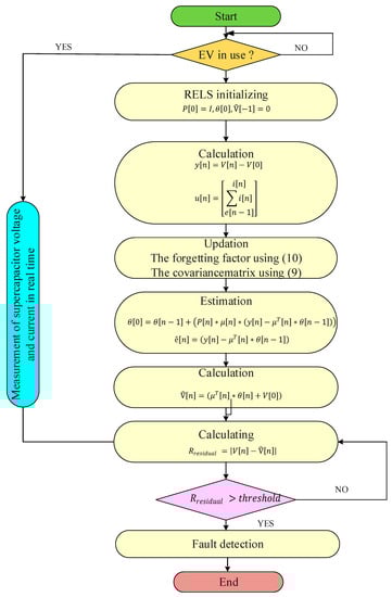 Oukaour et al. [66] introduced an RLS technique to diagnose the aging effect in the supercapacitor. The supercapacitor parameters such as equivalent series resistance (ESR) and equivalent capacitance were measured and analyzed. It was detected that supercapacitor aging resulted in an increase in ESR and a decrease in equivalent capacitance. The observed ESR curve with aging depicted acceptable outcomes. However, the developed technique only considered some parts of the component behavior. Naseri et al. [67] proposed a recursive extended least-square algorithm (RELS) technique for determining the ESR and equivalent capacitance towards an SOH estimation, as presented in Figure 8. The presented model obtained satisfactory outcomes considering ESR and noise dynamics.