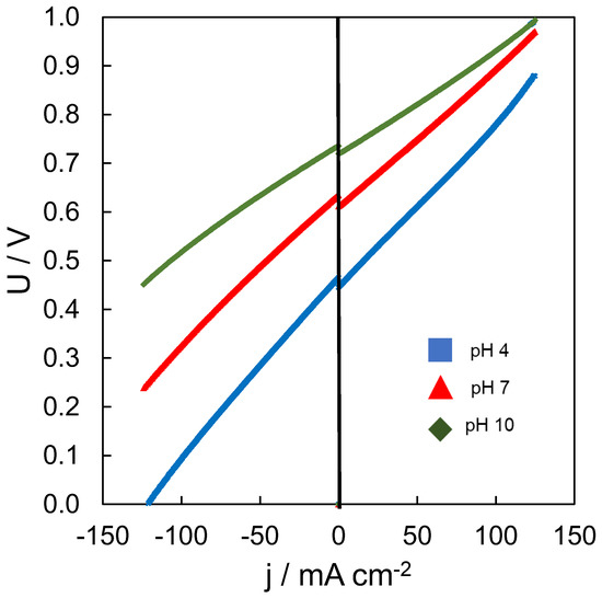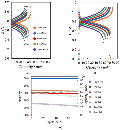 Regarding Ucell, it corresponded to the values measured at the OCV at 50% SOC. The redox potential of the AQDS decreased at higher pH values (Figure 2) and, consequently, the OCV increased. Higher pH values of the electrolytes established a higher OCV, which was observed in the LC at 0 mA/cm2 (see Figure 3). Regarding the voltage and energy efficiencies, the battery showing the highest cell ASR was the one using an electrolyte at pH 4 (lowest ionic conductivity) and therefore it provided the lowest efficiencies. On the other hand, the battery at pH 10 presented the highest ionic conductivity and consequently the highest voltage and energy efficiencies. The stability of the redox-active materials was truly affected by the environment of the electrolyte. An analysis of the capacity fade during the long cycling showed clear differences between the three studied pH values. The battery at pH 10 showed the highest capacity decay per hour and could be because of the low stability of the ferrocyanide in the basic media [49]. The battery at pH 7 was the most stable and it is logical to think that the redox-active materials were more stable in less aggressive solutions showing a notably low-capacity decay.