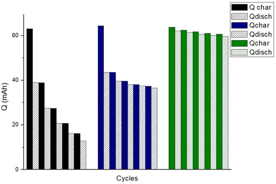 Firstly, the three systems should present similar initial resistance, otherwise, the results would not be comparable. After checking the resistance of the systems (0.99–1.02 Ohm·cm2), they were charged–discharged at 20 mA/cm2 up to the same cut-offs (1.1–0 V) during five cycles, Figure 4 shows a summary of the data included in Figures S9–S11 and Table S2 for the evaluations performed. The single cell exposed to atmospheric O2 concentrations showed a clear imbalance between both electrolytes. This fact is supported by looking at Figure 4, in particular the black columns. Once the battery was fully charged (first filled black column, 63.0 mAh, 94% SOC), it reacted with the oxygen present in the electrolyte solution, thus discharging the anolyte (first dashed black column, 39.0 mAh, 58.2% SOC), while the catholyte was fully charged. When the next discharging process started, the capacity of the anolyte was lower than the catholyte, and the capacity of the battery was limited by the amount of the reduced anolyte. So, as the single cell was exposed to constant O2 concentrations, O2 permeated into the solution and continuously discharged the battery. When the battery was exposed to smaller amounts of O2, such as in the home-made glovebox system (blue columns), the O2 had a big influence on the first cycle, but when the O2 present in the solution was consumed the effect was almost negligible because permeation was practically suppressed. Finally, if we look at the results achieved when the battery was placed in an atmosphere without O2 (commercial glovebox), the imbalance was negligible and no significant differences between the charge and discharge processes, even in the first cycle, were observed (green columns).